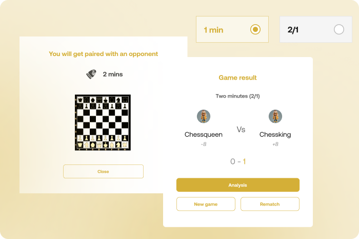 Compete in 1v1 games or ranked tournaments (bullet, blitz, rapid, classical). Earn Keens, unlock ranks, and win cash or prizes.